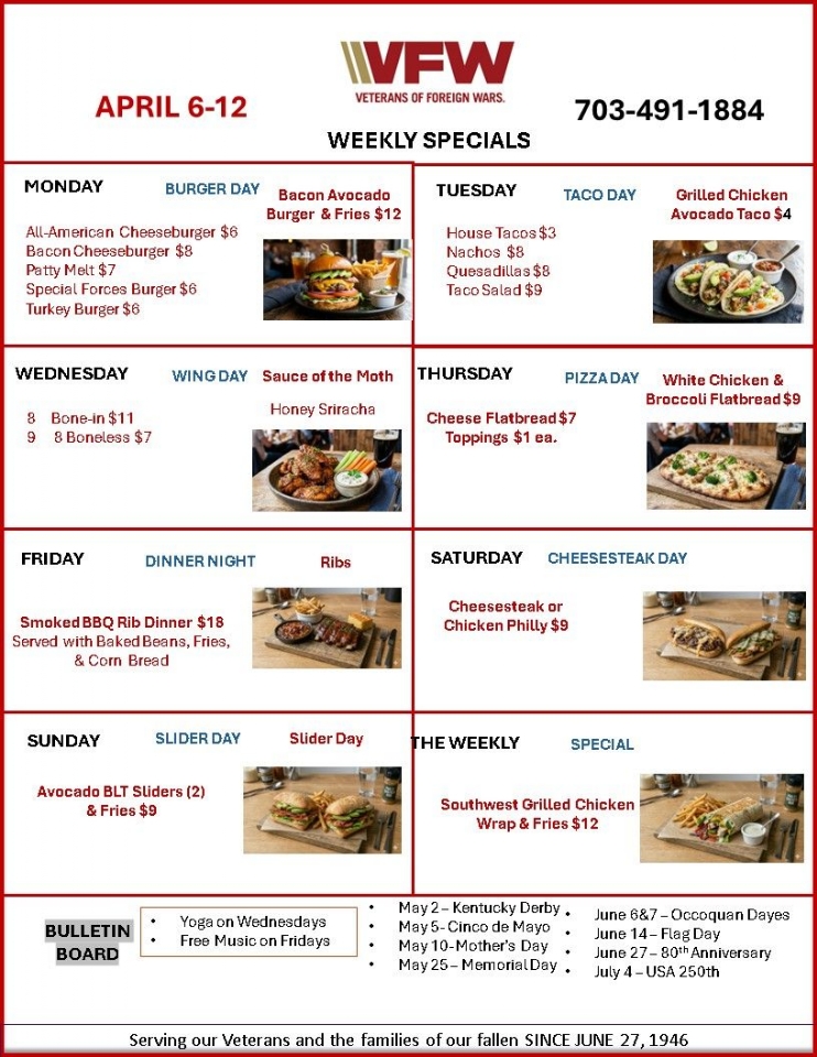 WE HAVE BEEN SELECTED AS VFW POST OF THE MONTH FROM THE OVER 6000 VFW POSTS WORLD WIDE. MAYOR PORTA CALLS US A STABLIZING FORCE FOR THE GOOD OF OCCOQUN